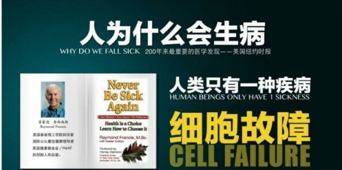 雷蒙德·泰朗西斯(美國(guó)麻省理工學(xué)院科學(xué)家、國(guó)際公認(rèn)最佳健康領(lǐng)導(dǎo)者、美國(guó)健康基金會(huì)HeAF的創(chuàng)始人和總裁)說(shuō)過(guò):人類只有一種疾病,就是細(xì)胞故障。