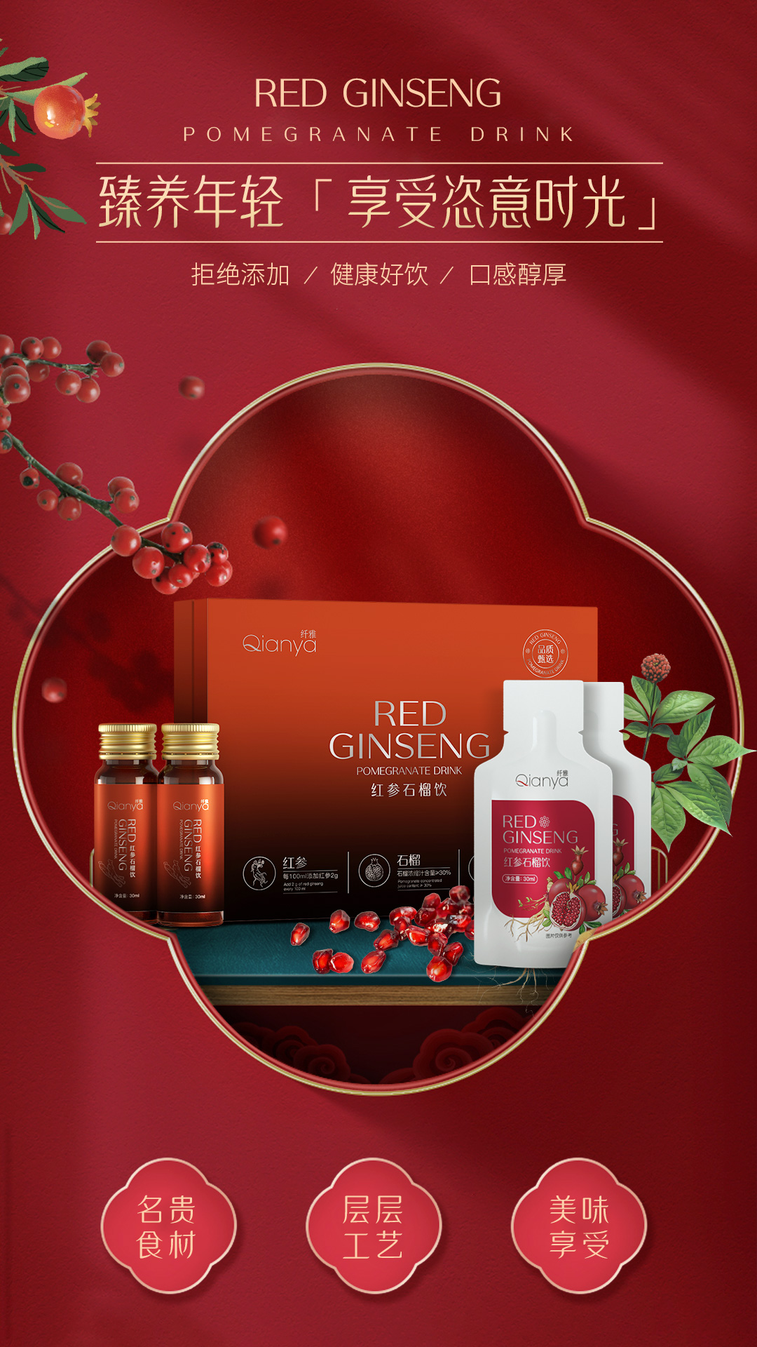 紅參石榴飲品,補(bǔ)精氣神、方便省時,補(bǔ)鐵、補(bǔ)xue氣,三效合一;采用長白山天然種植的5年紅參,七代傳承的東阿百年堂阿膠