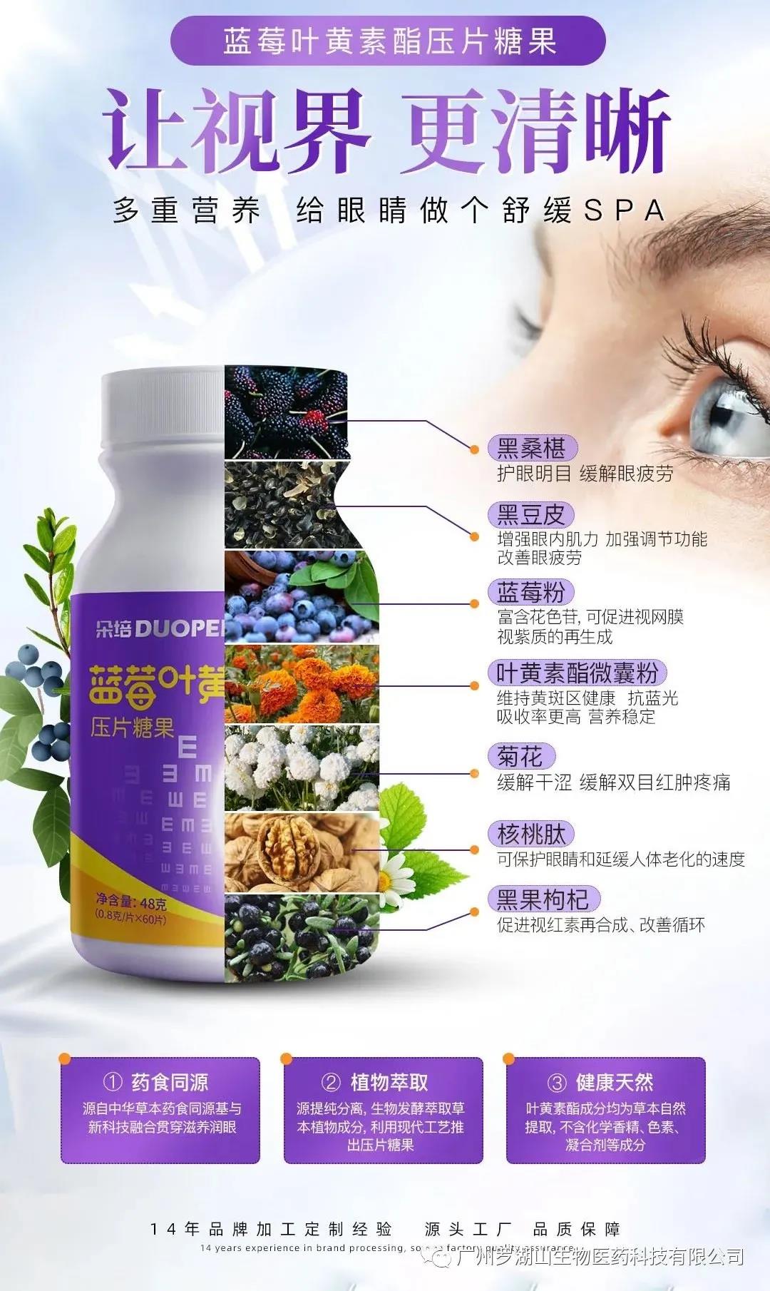 藍(lán)莓葉黃素酯壓片糖果,護(hù)眼養(yǎng)眼,精準(zhǔn)對抗藍(lán)光;減少自由基對眼細(xì)胞的損傷,6合1植物精華協(xié)同調(diào)理眼睛健康,3維護(hù)眼配方(補(bǔ)營養(yǎng)、抗損傷、抗疲勞),不添加化學(xué)合成色素、防腐劑
