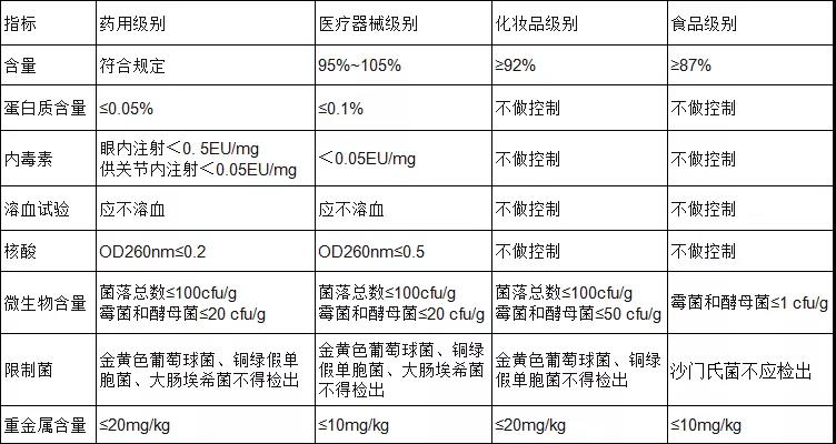 透明質(zhì)酸鈉各級別劃分及其對應(yīng)指標(biāo)
