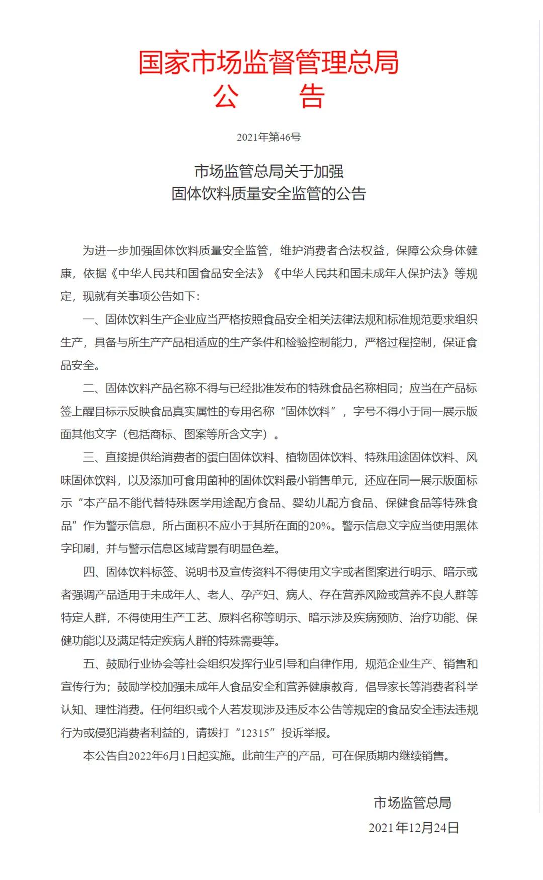 近日,國家市場監(jiān)管總局發(fā)布《關(guān)于加強(qiáng)固體飲料質(zhì)量安全監(jiān)管的公告》(以下簡稱《公告》),進(jìn)一步規(guī)范固體飲料標(biāo)簽標(biāo)注,嚴(yán)格固體飲料質(zhì)量安全監(jiān)管,切實(shí)維護(hù)消費(fèi)者合法權(quán)益。