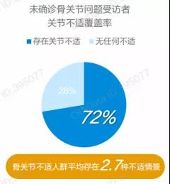 骨關(guān)節(jié)不適已是國(guó)民常見(jiàn)問(wèn)題。年齡、生活習(xí)慣、居住環(huán)境各異的人群,如中老年人、運(yùn)動(dòng)愛(ài)好者、超重人士、濕寒地區(qū)人群,都存在不同的關(guān)節(jié)健康困擾。根據(jù)2020年CBNData和阿里健康發(fā)布的《骨關(guān)節(jié)健康白皮書》顯示,72%的未確診人群都存在多種關(guān)節(jié)不適情景。